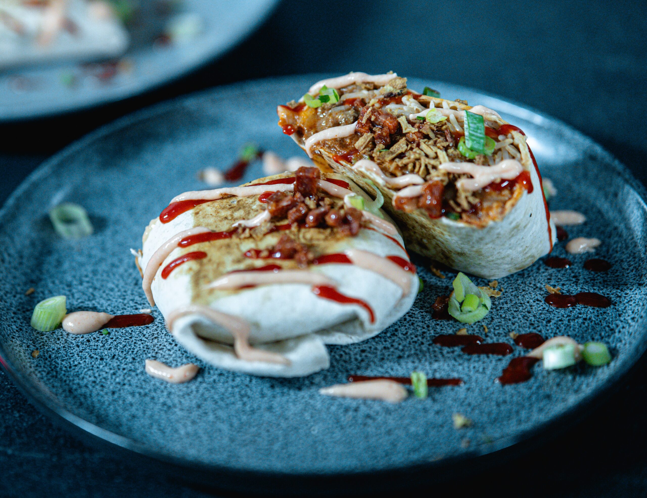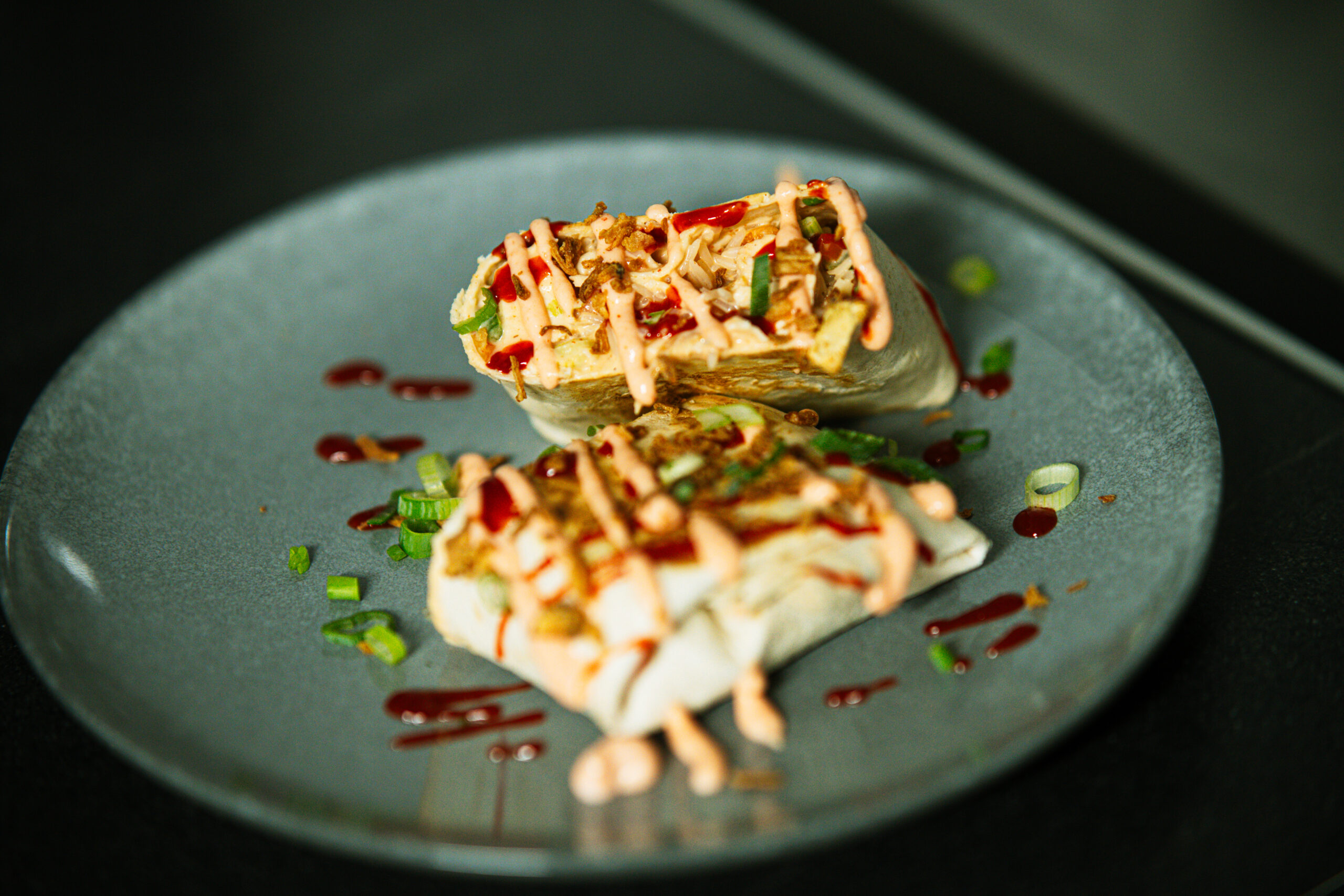 Slightly spiced chicken breast shredded and mixed with cream cheese, buffalo sauce, honey and spring onions. Accompanied with roasted peppers and onions, on top of rice, inside a tortilla wrap.