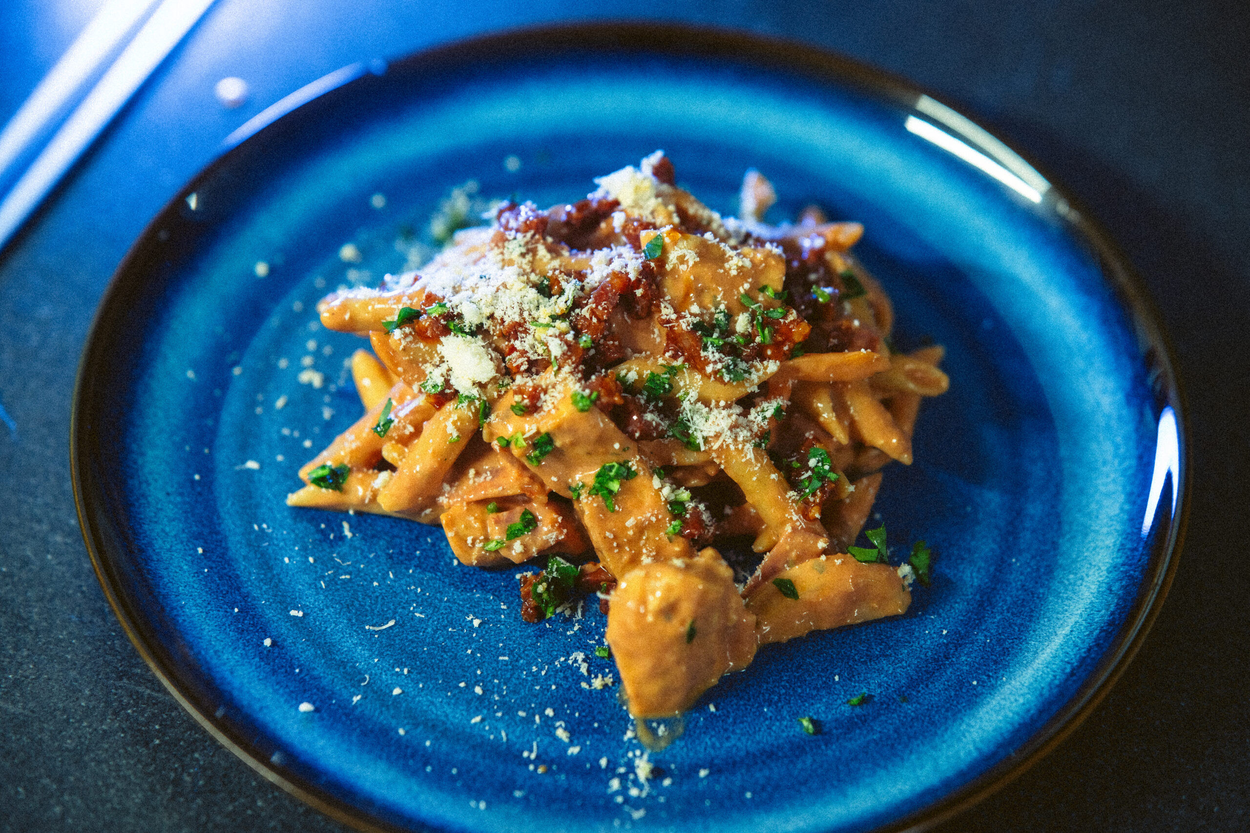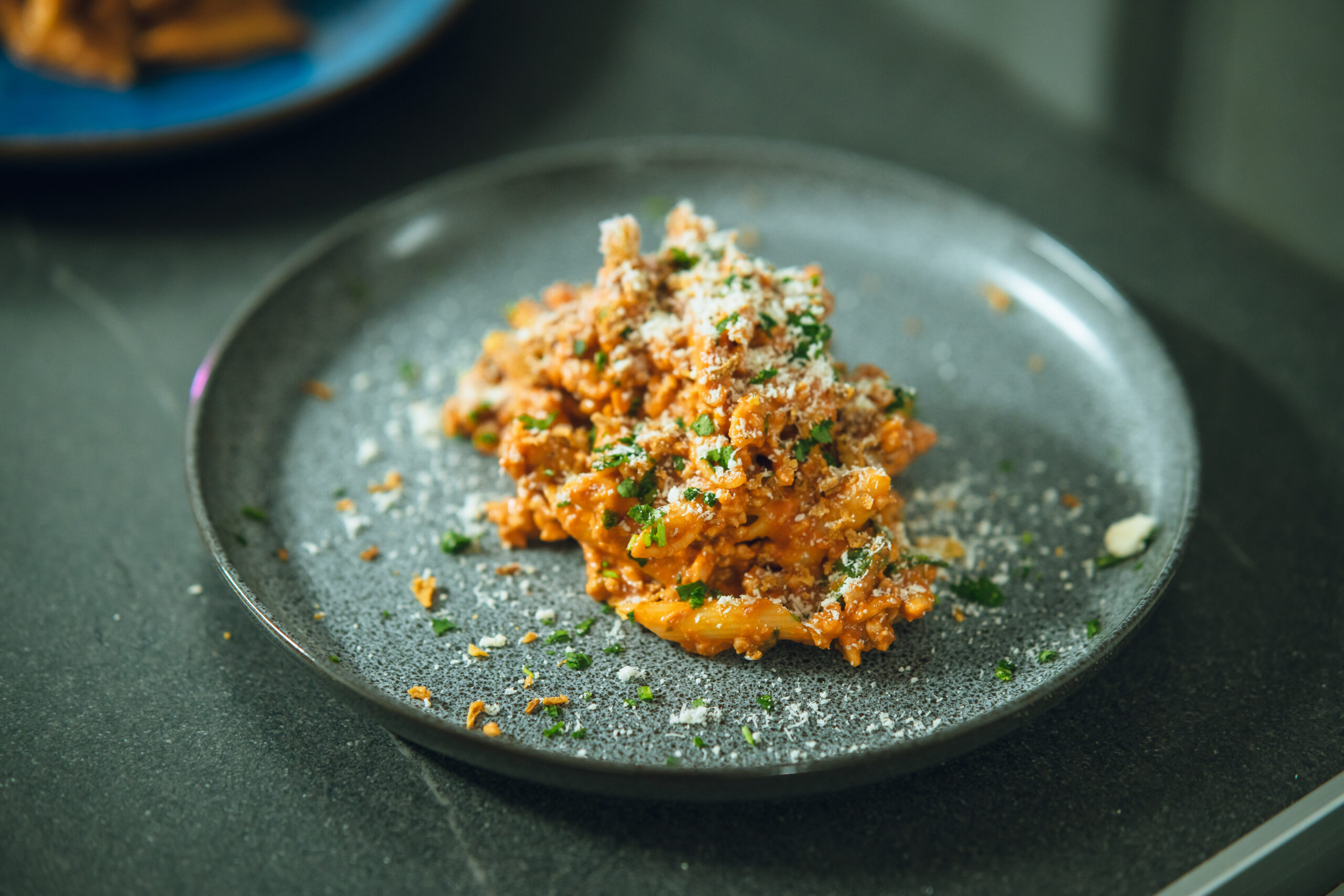 Lean crumbled Italian pork sausage mince, onions and peppers in a creamy tomato sauce infused with chilli, garlic, and Italian herbs. Served with penne pasta and topped with Parmesan and fresh chillies.