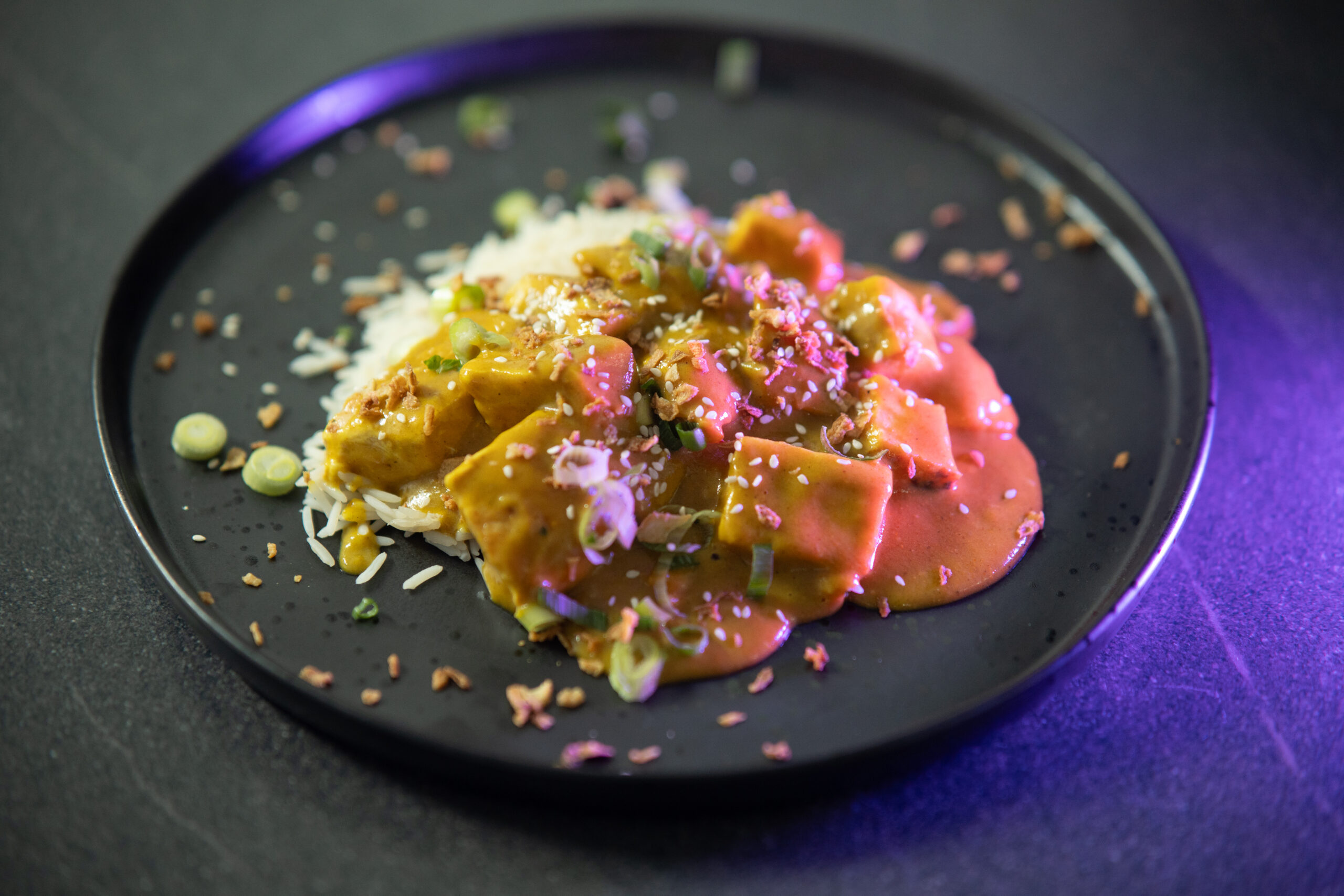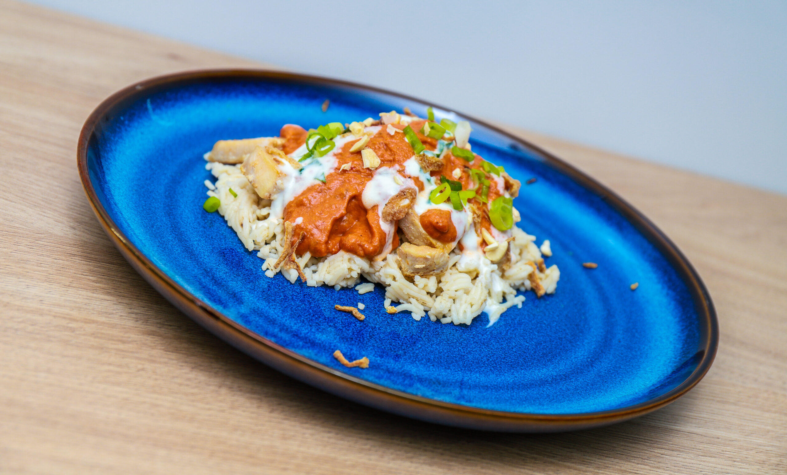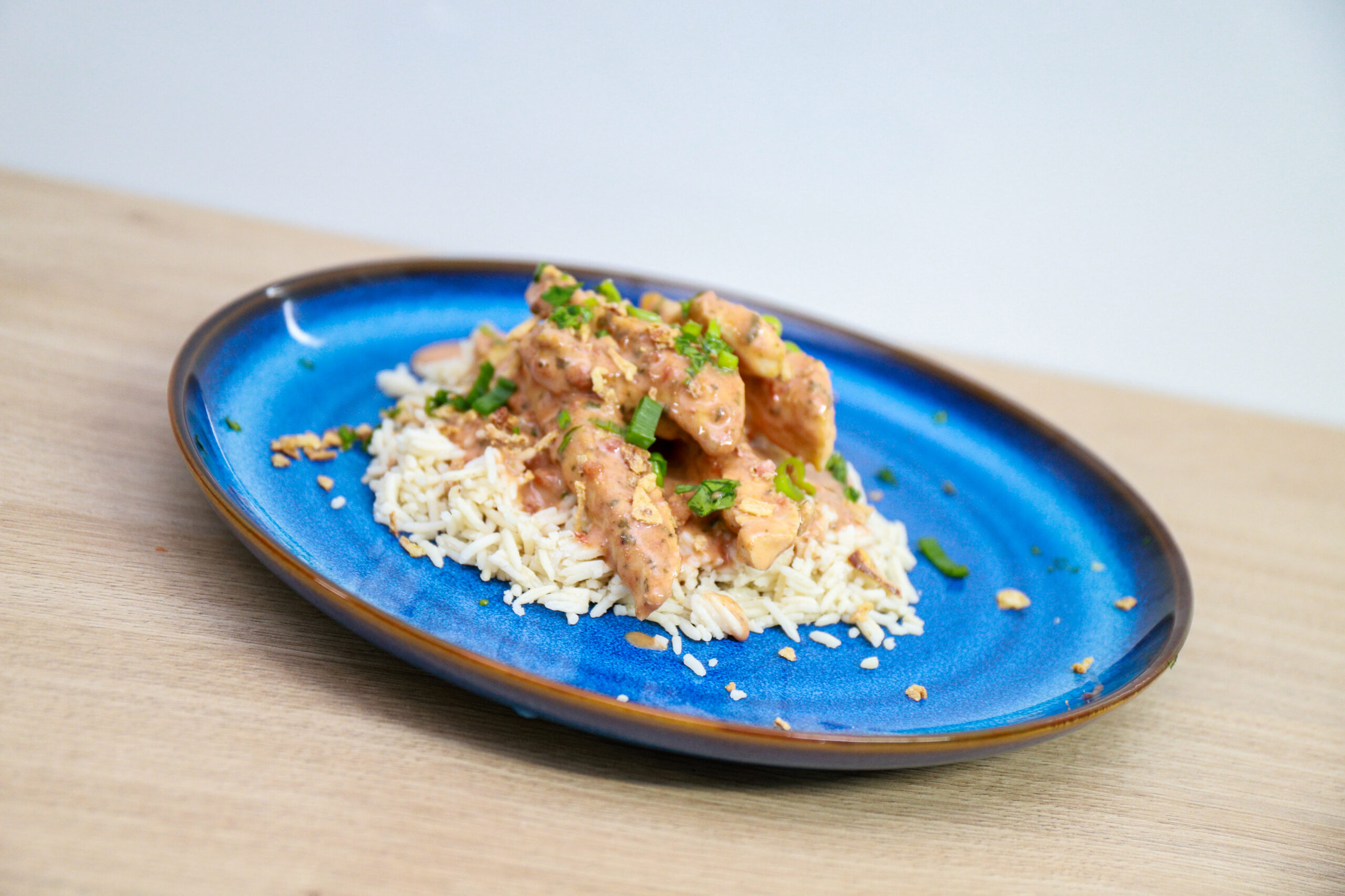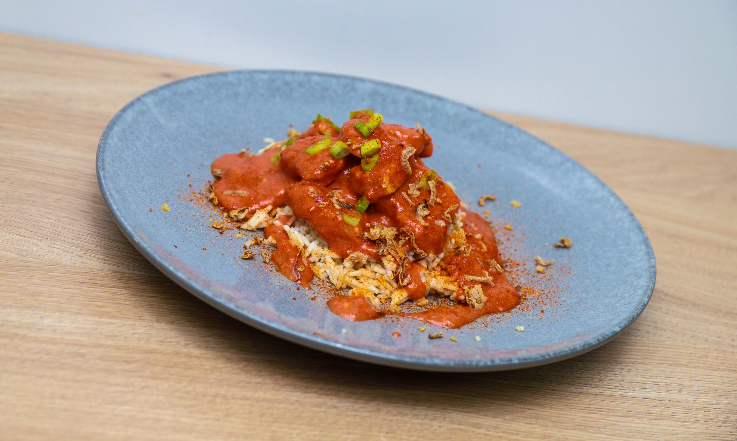 Sliced chicken breast in a smooth, fragrant butter chicken sauce with Indian herbs and spices, ground cashew nuts and coriander. Served on top of steamed rice and garnished with crushed cashew nuts and coriander.