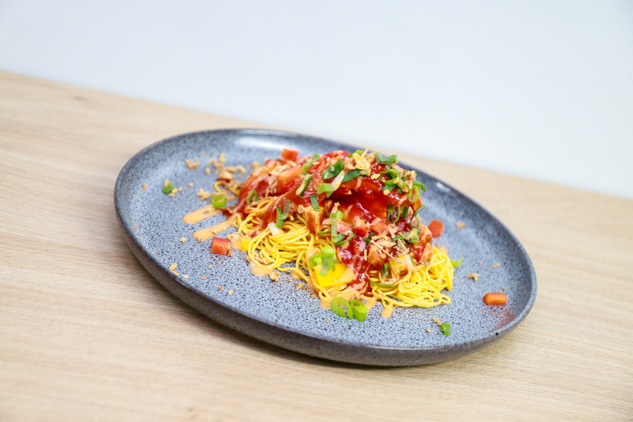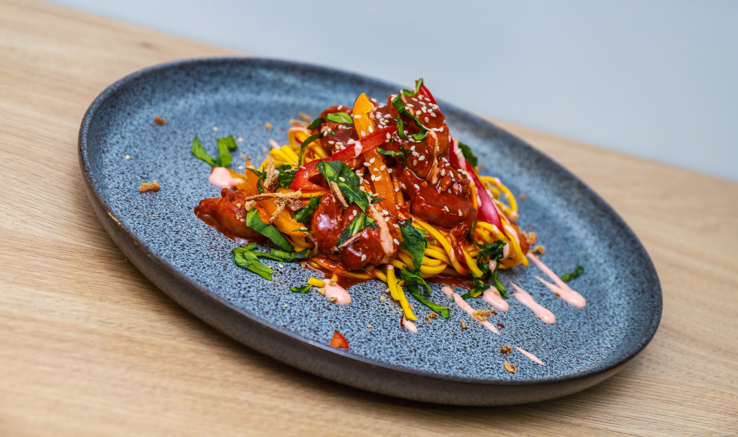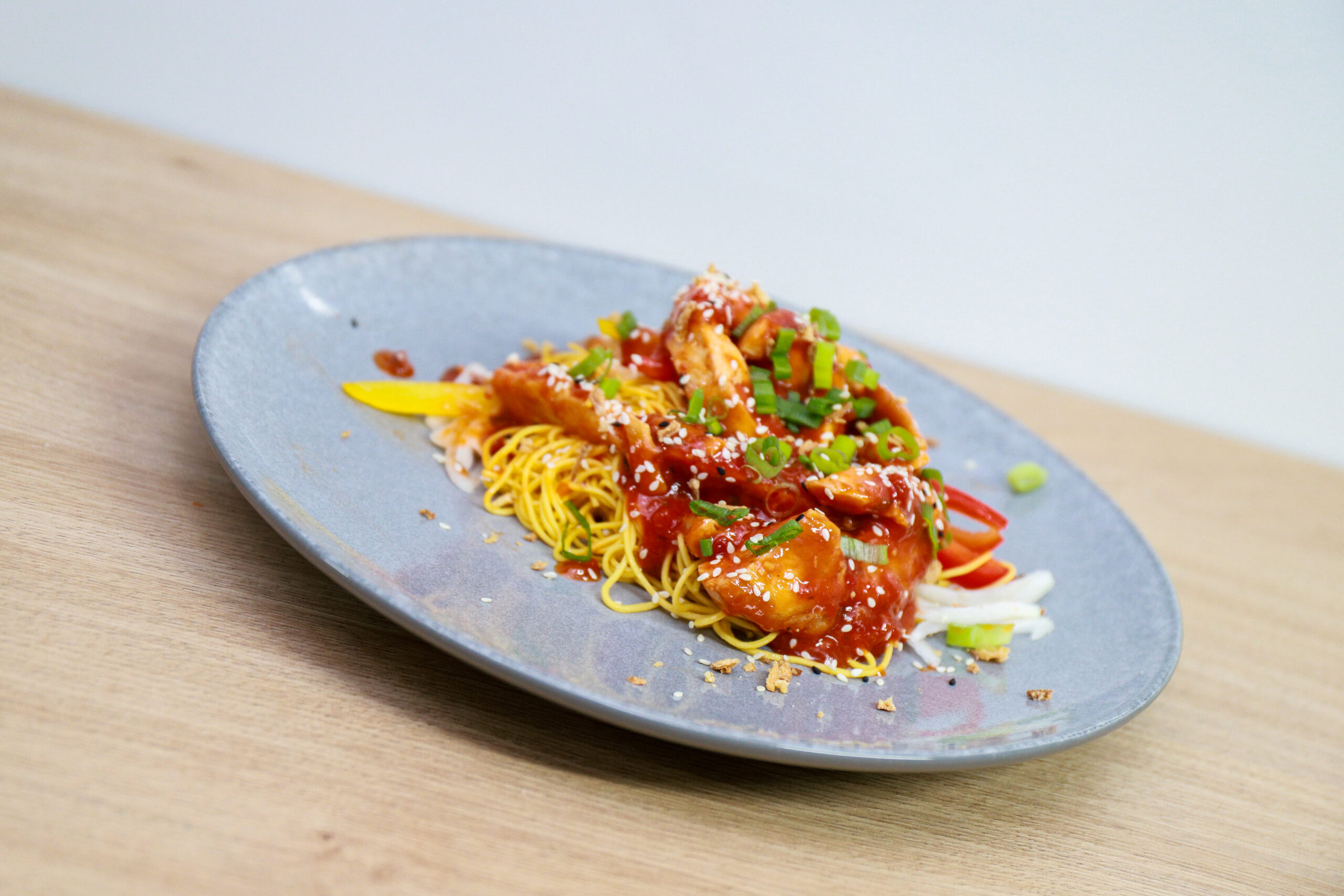 Fine noodles topped with chicken breast coated in a Sriracha honey sauce and drizzled with spiced Greek yoghurt.
