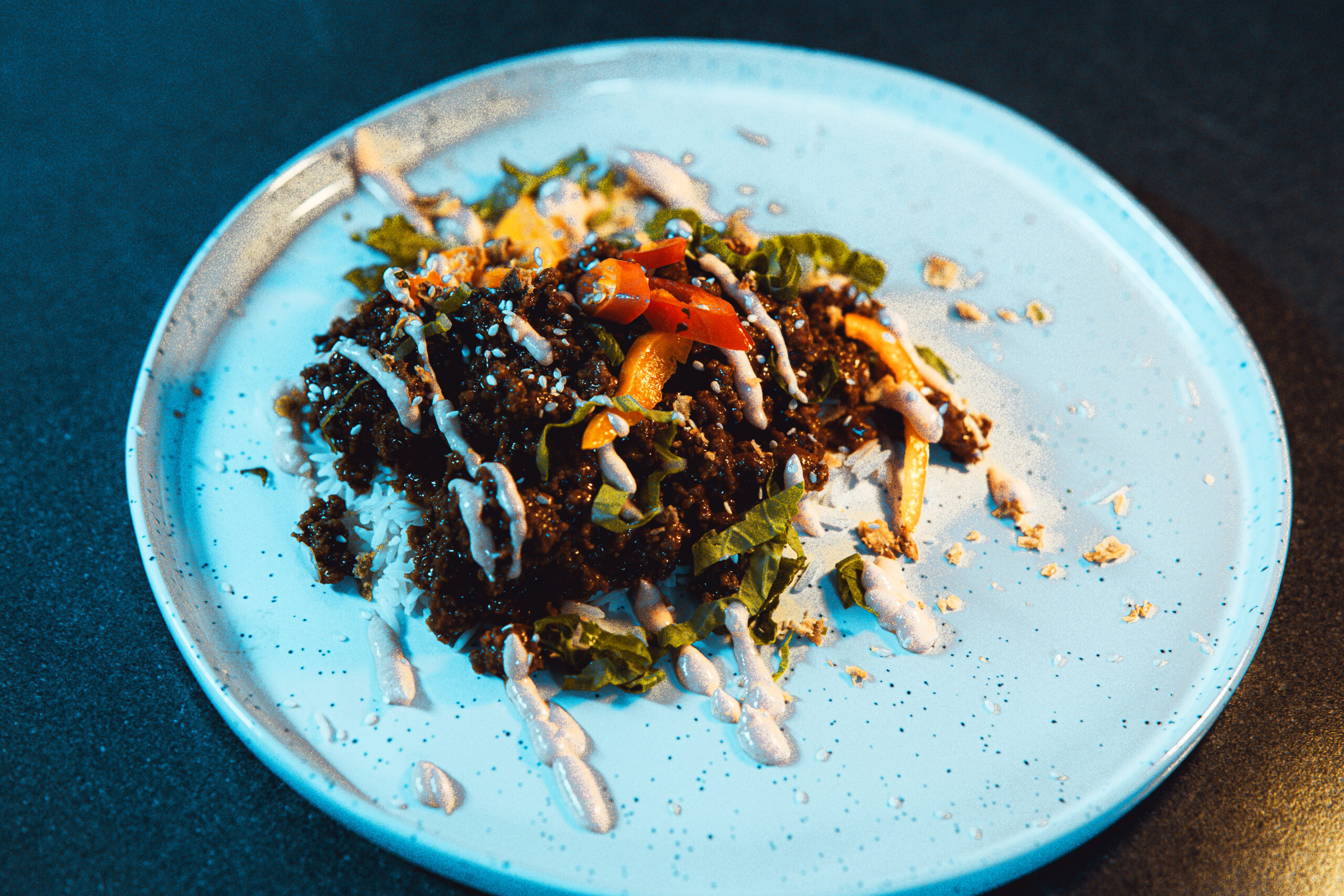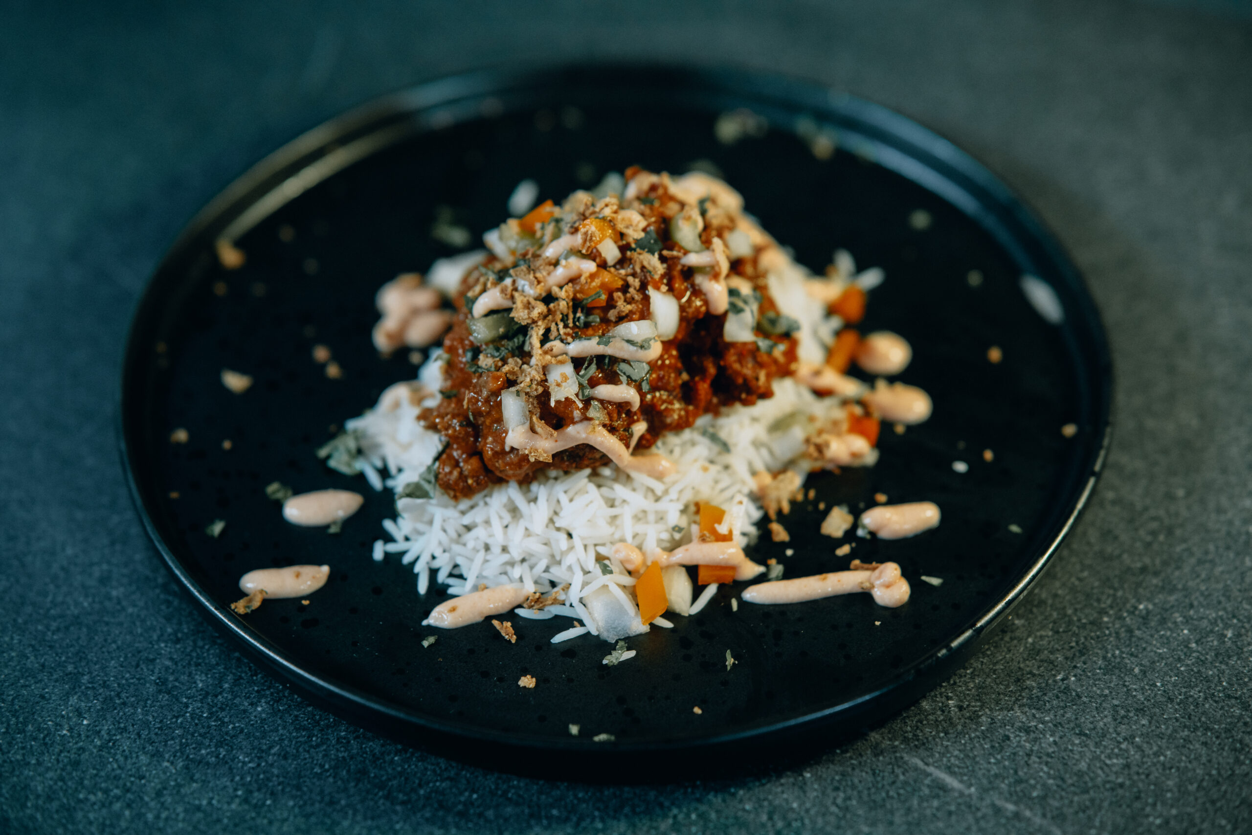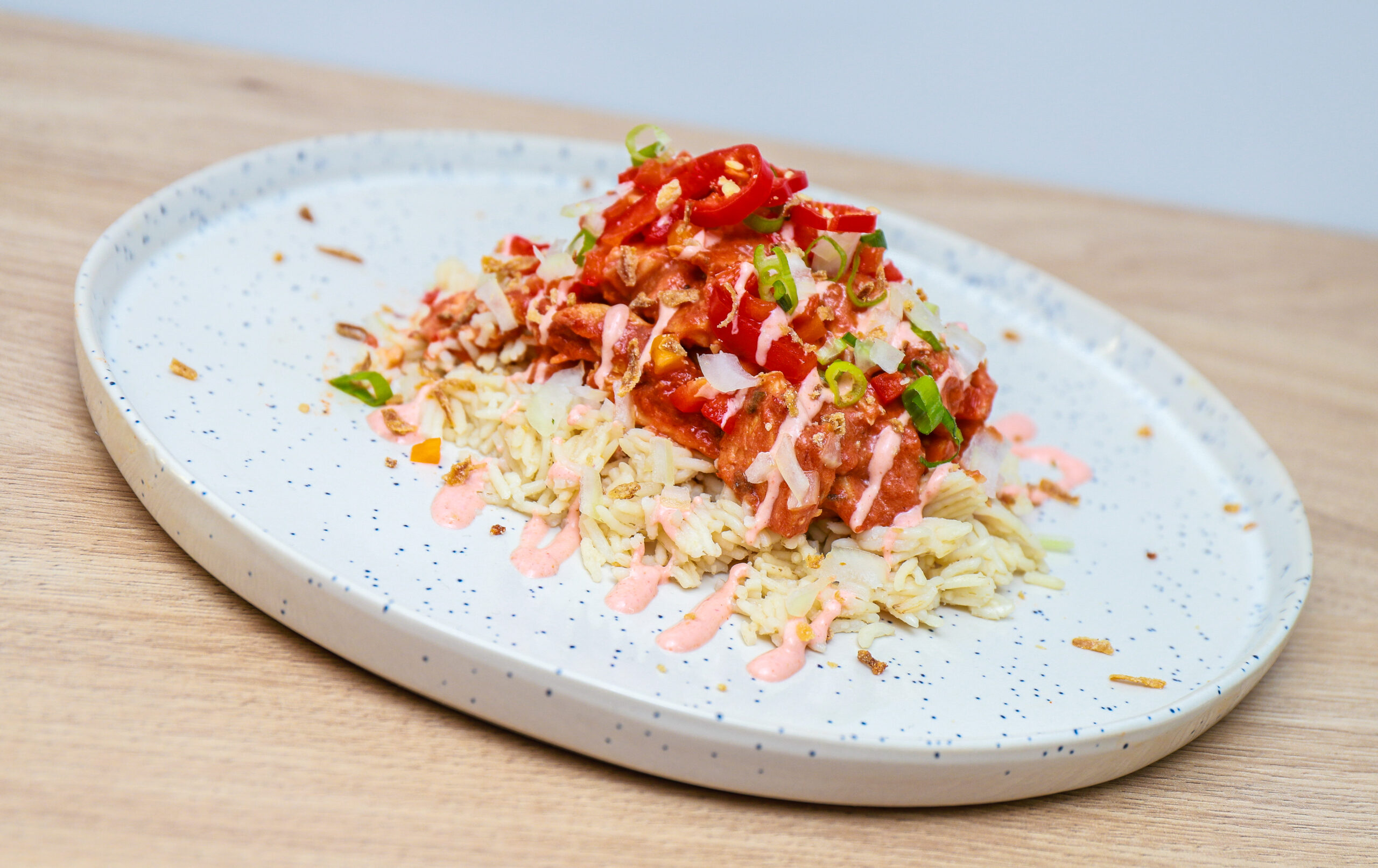 Lean beef mince, peppers and onions, coated in soya bean paste, gochujang and honey. Served on a bed of steamed rice topped with spring onions, sesame seeds, crispy onions and chilles