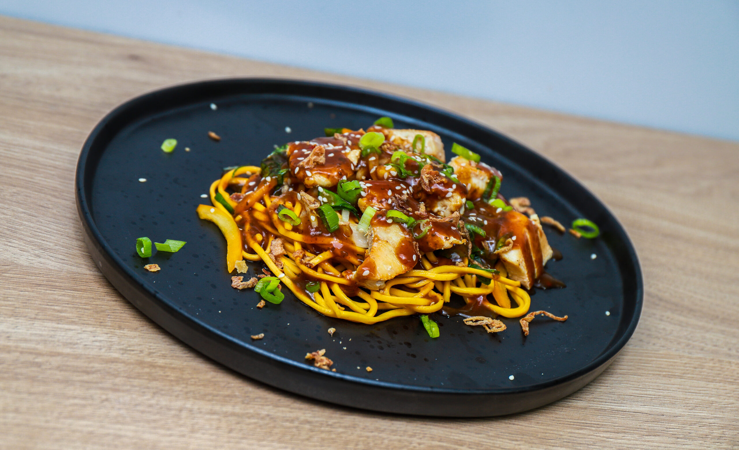 Sliced chicken breast, onions and Chinese leaves coated in a Chinese style rich, savoury chow mein sauce served on top of noodles, garnished with sesame seeds & spring onions.