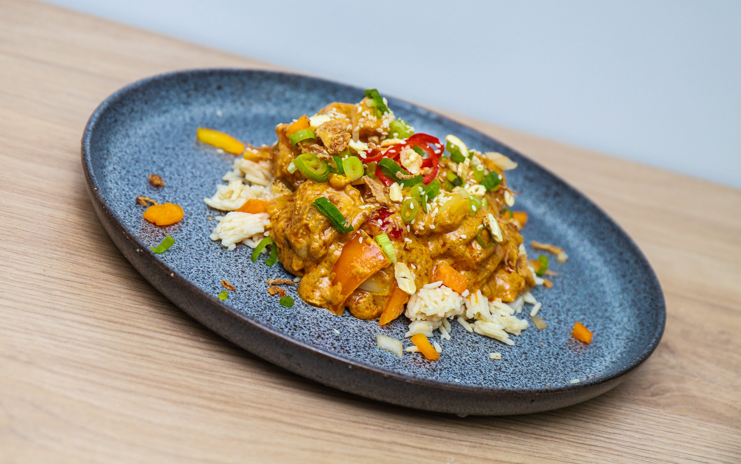 Our signature satay sauce with chicken breast, peppers and onions. Served on top of a bed of steamed rice and topped with sesame seeds and spring onions.