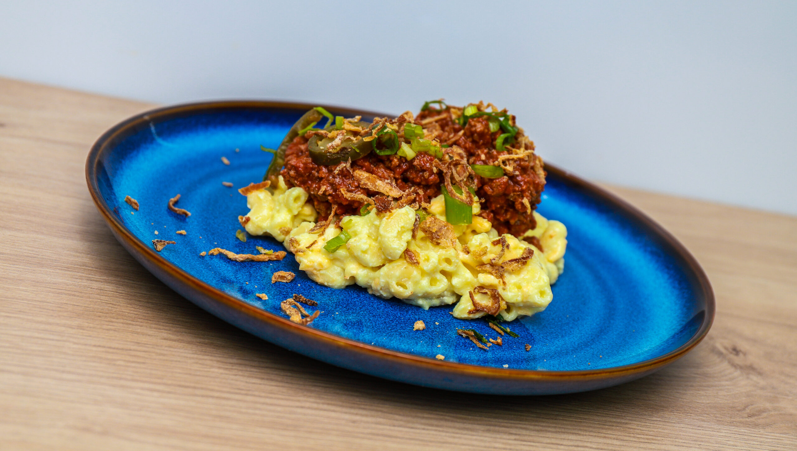 Chilli con carne style lean beef mince with diced onions, peppers and tomato passata. Served on top of a rich, creamy, light cheese & jalapeño infused macaroni pasta. Topped with spring onions, and crispy onions.